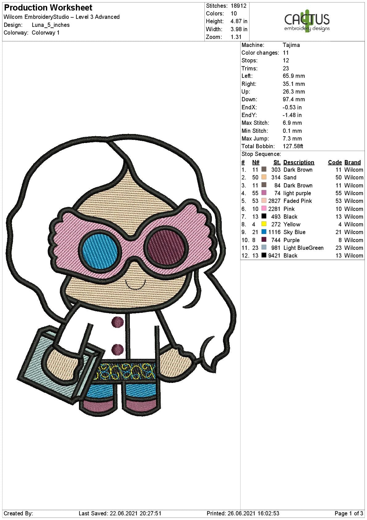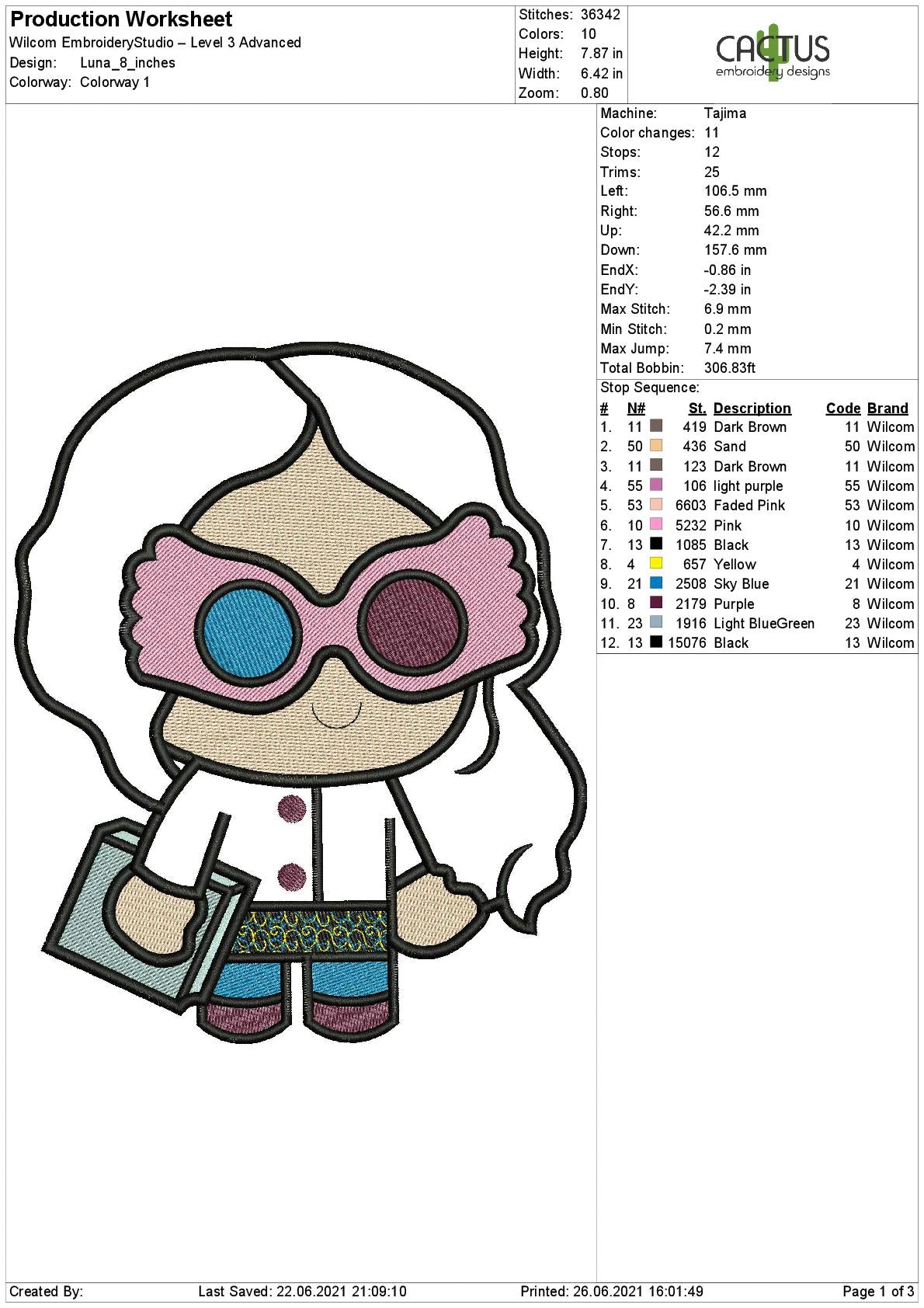 Embroidery design includes such sizes and thread colors:
