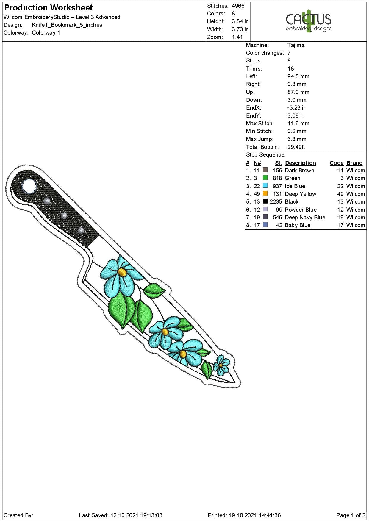 Embroidery design includes such sizes and thread colors: